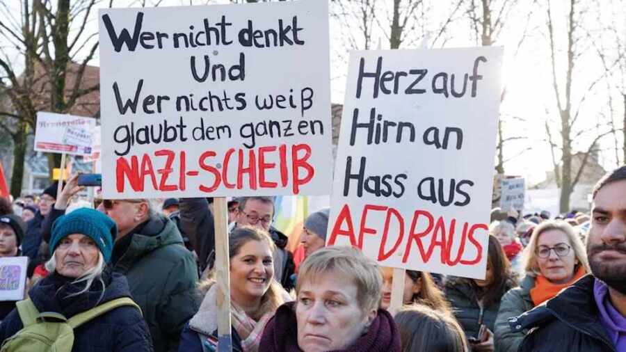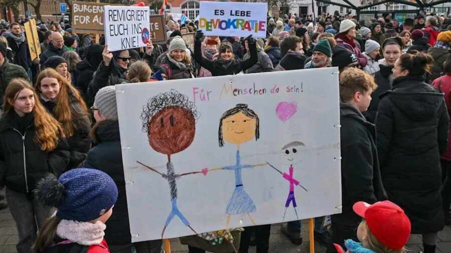 «В минувшие выходные сотни тысяч людей вышли на улицы городов Германии, выступив против правого радикализма. Сегодня аналогичные акции проходят вновь. В Оснабрюке на митинг собрались около 25 000 человек. Перед ними выступил глава Минобороны ФРГ Борис Писториус. Он провёл параллель с Веймарской республикой (1918-1933), которая пала с приходом к власти Адольфа Гитлера. «Сегодня мы знаем лучше: история не должна повториться», — сказал он. В Зигмарингене на акцию собрались несколько тысяч человек. Перед ними выступил премьер-министр федеральной земли Баден-Вюртемберг Винфрид Кречман. В Киле на акции собрались более 10 000 человек. Выступивший обер-бургомистр Ульф Кампф также провёл параллель с Веймарской республикой, заявив, что «наша демократия более стабильна, чем демократия 100 лет назад, но давайте не будем слишком уверены». Многотысячные акции также проходят в баварских городах Айхах, Штраубинг, Пассау и Ноймаркт-ин-дер-Оберпфальц, во Франкфурте-на-Одере, а также в Дюссельдорфе, где на протест вышли около 50 000 человек».