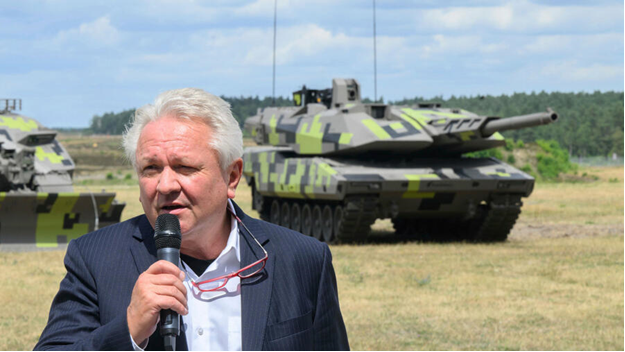 Председатель германской группы Rheinmetall AG Армин Паппергер на фоне опытного образца танка Rheinmetall KF51 Panther