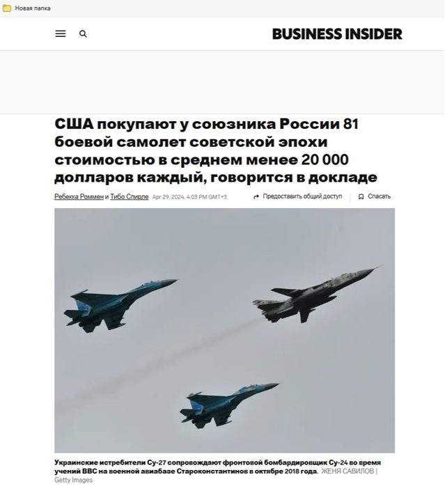 Издание ссылается на сообщения украинского Telegram-канала Insider UA и российского новостного сайта Reporter, в которых говорится, что США приобрели 81 устаревший непригодный для использования военный самолет.»