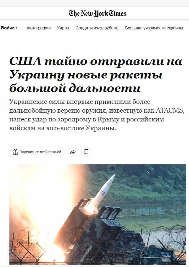 «The New York Times отмечает, что США и раньше отправляли Украине ракеты ATACMS, но их дальность составляла 100 миль, то есть 165 км. Украинская сторона неоднократно просила поставить новую модификацию ракеты, дальность полета которой составляет 190 миль (более 300 км). Решение о поставках ракет большей дальности, по словам собеседника издания, президент США Джо Байден принял в феврале. США тайно передали Украине более 100 дальнобойных ракет ATACMS, пишет The New York Times со ссылкой на источники.»