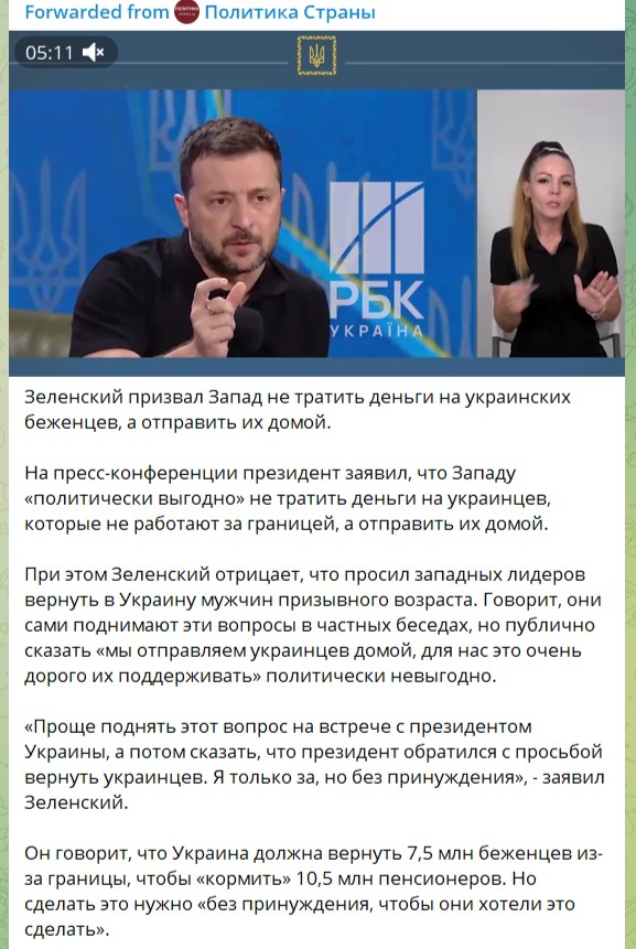 Запад не дурак воевать за других. Его классическая война это именно война чужими руками. И потому этих рук, ног и поголовья в целом должно быть не просто много, но очень много. И если так на это посмотреть, то на Украине резервов еще немерено.Во всяком случае, столько, что Европа еще долго может отдыхать в своем «цветущем саду». Просто кое-что для этого нужно подправить. Киевская челядь Вашингтона такую команду уже получила и готова её усердно выполнять. Тем более, что от этого зависит и выживание самой укроверхушки. Ожидаются радикальные меры по скорейшему и,естественно, «абсолютно добровольному»возвращению на Украину миллионов т.н. «релокантов»,которые нужны там, якобы, чтобы кормить оголодавших пенсионеров. А на самом деле кормить червей на фронтахсамоистребительной войны.