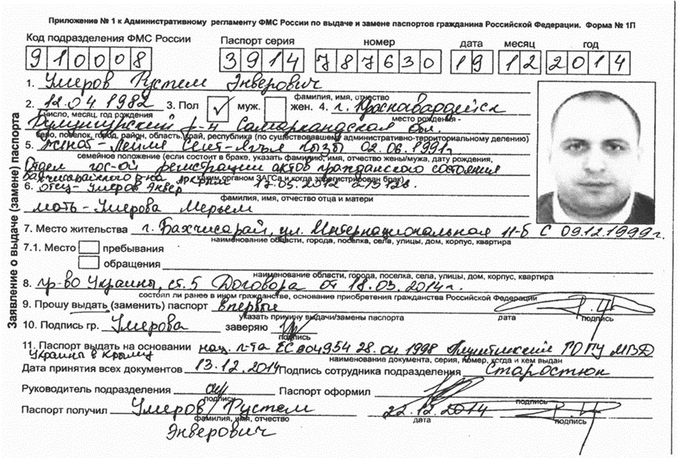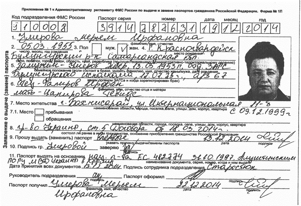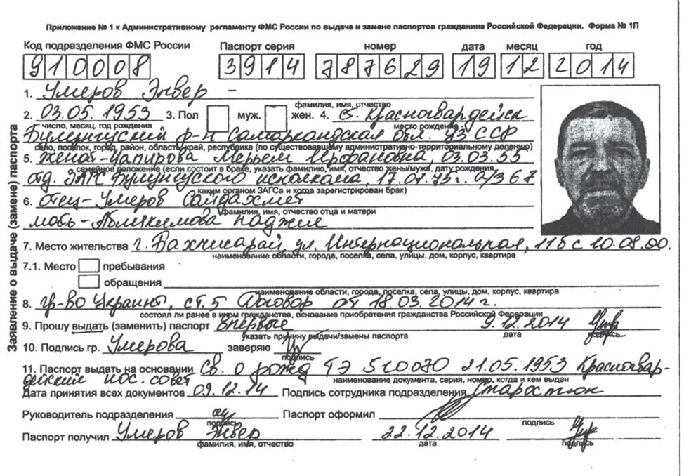 Особо активно тиражируются копии паспортной формы №1 (1П), якобы поданной Рустемом Умеровым, его матерью и отцом в декабре 2014 года, что должно свидетельствовать о наличии у них российского гражданства.