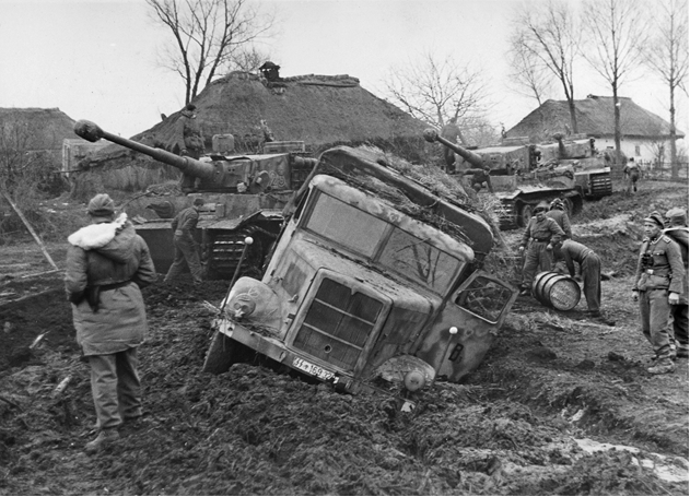 Танки Pz.Kpfw. VI «Тигр» и застрявший грузовик MAN ML4500 дивизии СС «Лейбштандарт Адольф Гитлер» в районе Винницы. На крыле грузовика, над надетым на фару противогазом, различима тактическая эмблема дивизии.