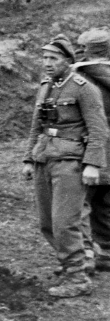 Но мы не будем утомлять глаза, пытаясь разглядеть эту эмблему. Обратим лучше внимание на эсэсовца в правом углу кадра. Того самого, который «образец нации», «белокурая бестия» и все такое прочее. Специально для этого увеличим кадр.