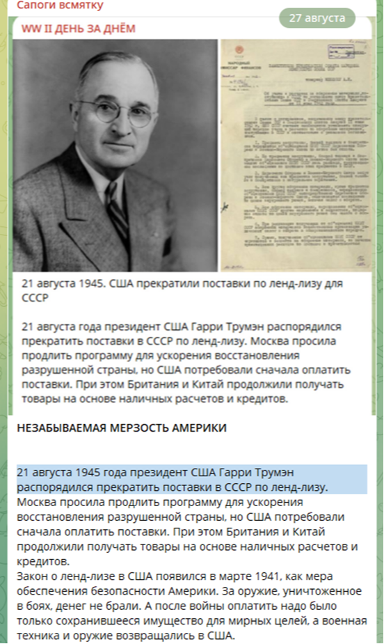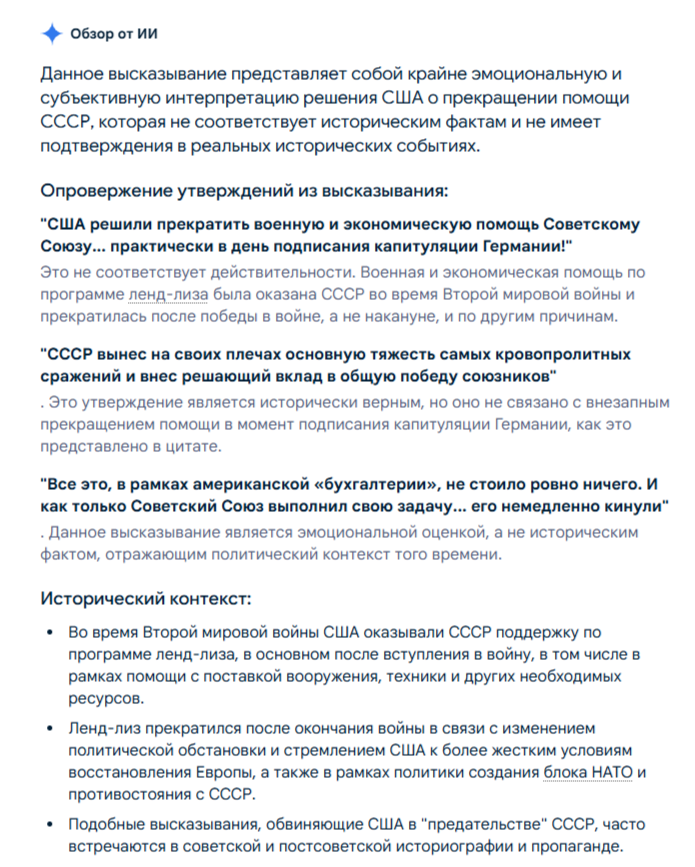 Это не соответствует действительности. Военная и экономическая помощь по программе ленд-лиза была оказана СССР во время Второй мировой войны и прекратилась после победы в войне, а не накануне, и по другим причинам.»