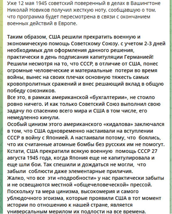 «Таким образом, США решили прекратить военную и экономическую помощь Советскому Союзу. с учетом 2-3 дней необходимых для оформления данного решения, практически в день подписания капитуляции Германией!