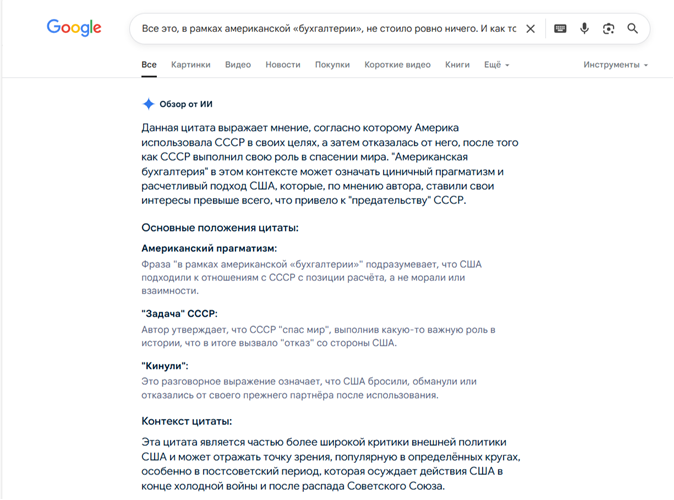 В порядке эксперимента, небольшую часть этой текста я поместил в поисковик ГУГЛ с целью получить реакцию так называемого «ИИ» на ее содержание.
