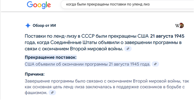 В данном случае мой высокоинтеллектуальный собеседник явно разволновался, сбитый с толку моими недоговорками. И стал опровергать сам себя при запросе о дате американского решения о прекращении поставок СССР по ленд-лизу: