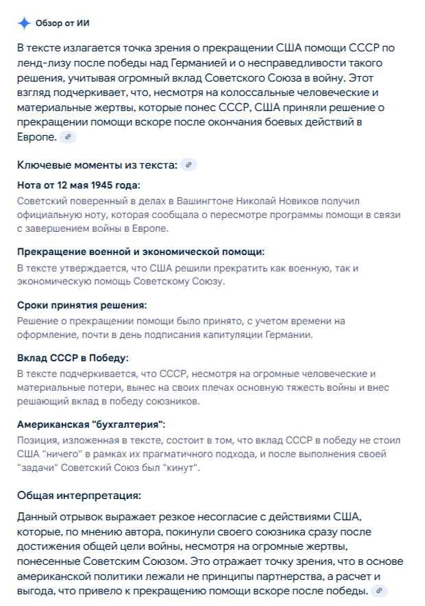 Тем временем настал третий акт «марлезонского балета», в котором ваш покорный слуга решил раскрыть карты и перестать испытывать на прочность своего механического собеседника. Для чего выложил в ГУГЛ свое видение темы прекращения американских военных поставок СССР уже без всяких купюр.