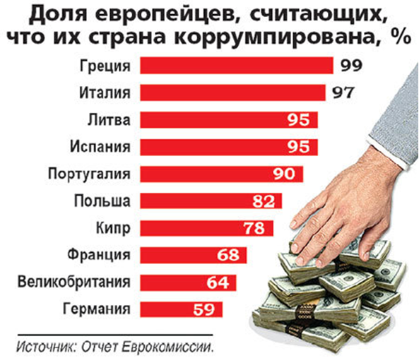 Масштаб проблемы поражает воображение, – призналась еврокомиссар по внутренним делам Сесилия Мальмстрем. По оценкам экспертов, из-за процветания коррупции во всех 28 государствах экономика ежегодно теряет 120 млрд. евро, что сопоставимо с общим евробюджетом. Главный вывод доклада: представления о ЕС как о зоне действия четких, всеми соблюдаемых правил и исключительно благоприятных условий для ведения бизнеса – миф. Опрос жителей показал, что в среднем по ЕС 76 процентов из них уверены: за последние три года их страна «погрязла в коррупции».