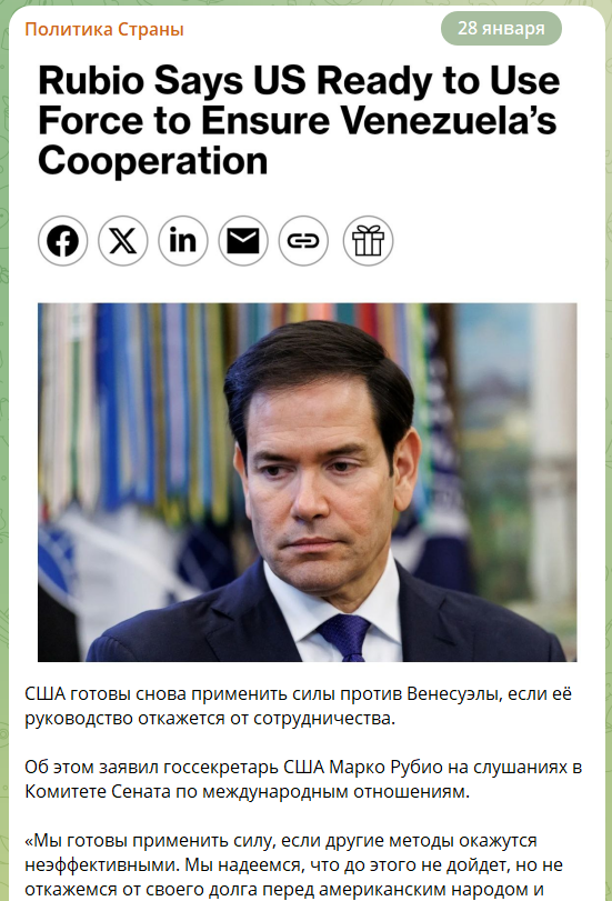 «9.01.26: США немедленно начнут перерабатывать и продавать до 50 млн баррелей нефти из Венесуэлы, и будут заниматься этим бессрочно, заявил Трамп. «Мы будем принимать решение о том, какие нефтяные компании туда зайдут, кому мы разрешим войти. Мы заключим сделку с компаниями…».