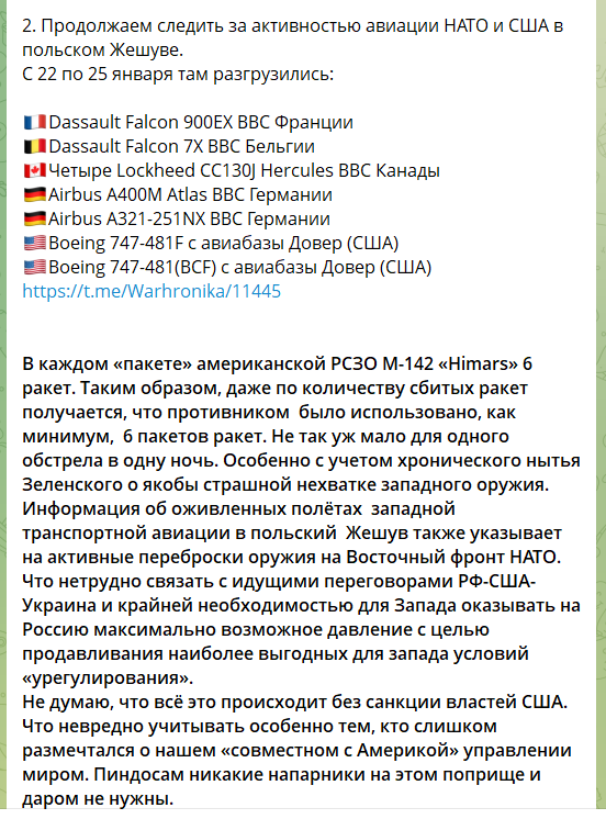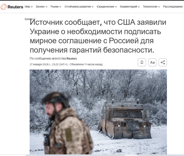«28.01.26: США сообщили Украине, что она должна подписать мирное соглашение с Россией, чтобы получить американские гарантии безопасности. Об этом пишет Reuters со ссылкой на источник, знакомый с ходом переговоров. При этом источник агентства оспаривает информацию Financial Times по которой США ставят гарантии в зависимость от вывода ВСУ из Донбасса.