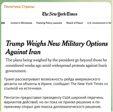«Сообщение Reuters: Трамп рассматривает возможность ударов по правительственным и оборонным объектам в Иране, чтобы побудить протестующих возобновить демонстрации. В частности, рассматривается возможность атаки на высокопоставленных лиц, которых США считают ответственными за подавление последней волны протестов — в надежде, что это вернет уверенность протестующих в том, что они теперь могут свергнуть режим.