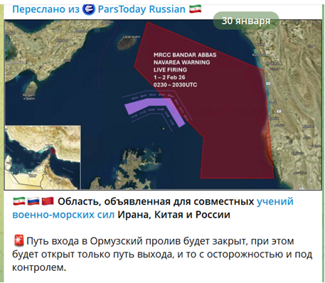«Иран объявил, что 1 и 2 февраля проведет военные учения с боевой стрельбой в Ормузском проливе, через который проходит около 20% мировых поставок нефти, передает Al Arabiya. Также сегодня Тегеран пообещал «сокрушительный ответ» на любое нападение после угроз Трампа нанести удар. На днях заместитель командующего военно-морскими силами КСИР пригрозил закрытием Ормузского пролива, жизненно важного водного пути, который Тегеран уже неоднократно угрожал закрыть в прошлом, но никогда этого не делал.»