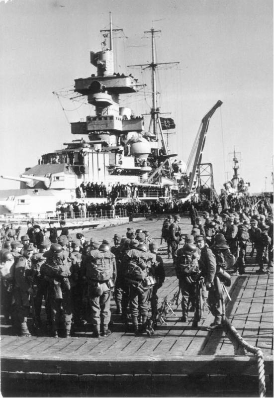 Тяжелый крейсер «Адмира Хиппер» принимает десант для атаки Норвегии. 6.04.1940